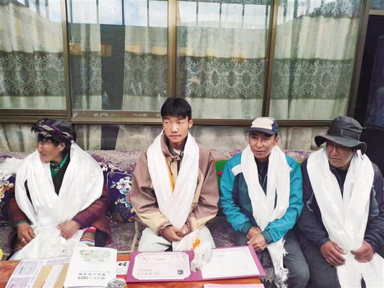 收到清華大學錄取通知書,大家給久米次仁及家人獻上哈達。圖由久米次仁提供