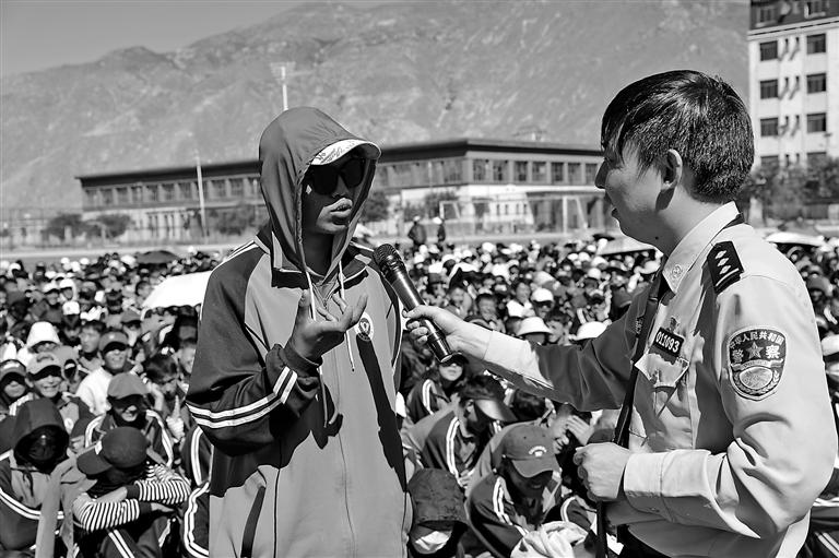 宣傳活動中,拉薩市第一中等職業(yè)技術學校學生和區(qū)公安廳網(wǎng)安總隊民警熱情互動。記者 彭琦 攝