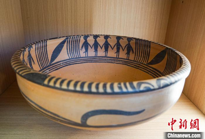圖為中心內(nèi)展出的仿制文物、出土于青海大通上孫家寨的馬家窯時期的舞蹈紋彩陶盆。馬銘言攝