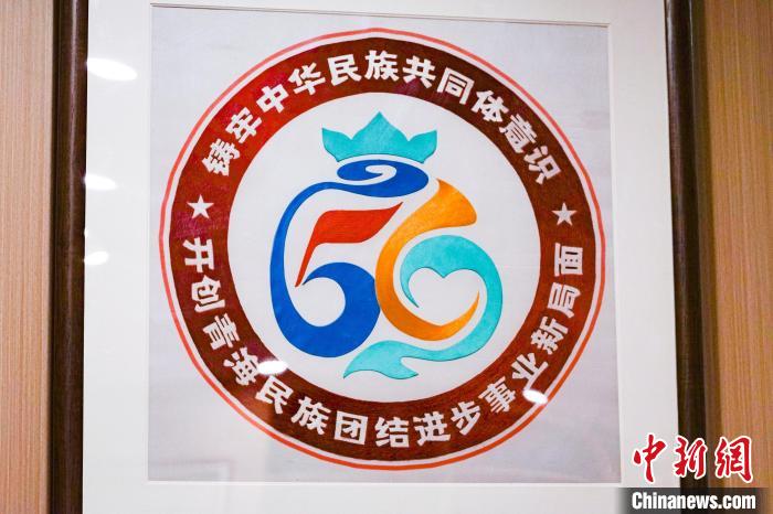 圖為中心內(nèi)展示的青海省民族團結(jié)進步形象標識刺繡作品。馬銘言 攝