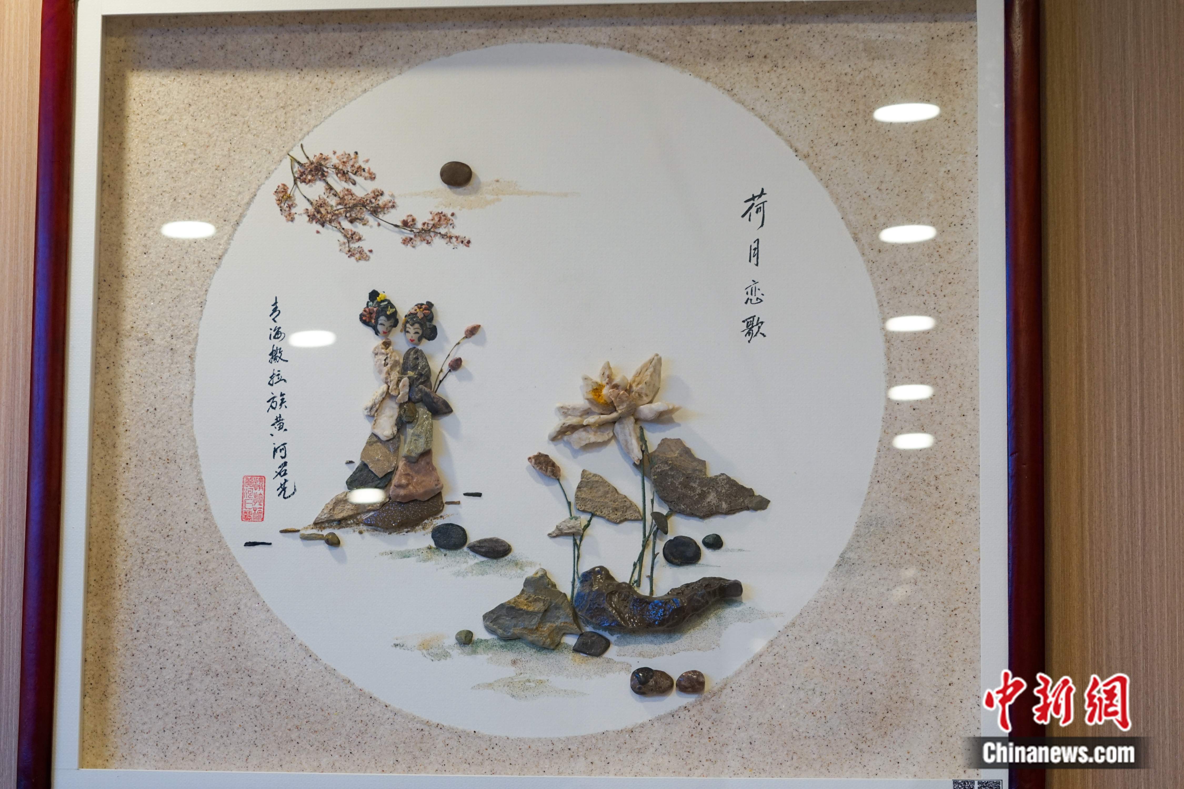 墻上懸掛的青海省民族團結(jié)進步形象標識,由多種少數(shù)民族刺繡共同制作而成;撒拉族婦女純手工制作的黃河石藝畫色調(diào)古雅、未經(jīng)雕琢,畫面呈現(xiàn)天然立體感,意境悠遠朦朧。