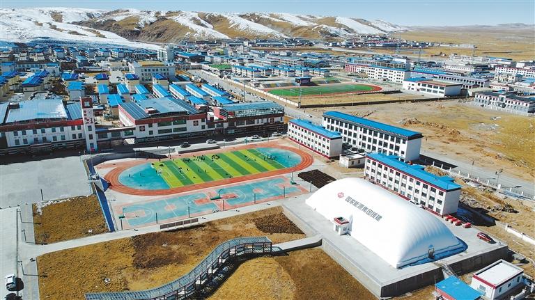 一場冬雪初晴,聶榮草原的空氣中彌漫著清新的氣息。嶄新的塑膠操場上,活躍著孩子們青春的身影。四周的教學(xué)樓、宿舍樓、多功能教室、氣膜球館等現(xiàn)代化建筑參差錯落,儼然是這座高海拔縣城的新地標(biāo),映射著草原教育發(fā)展的鏗鏘步伐。