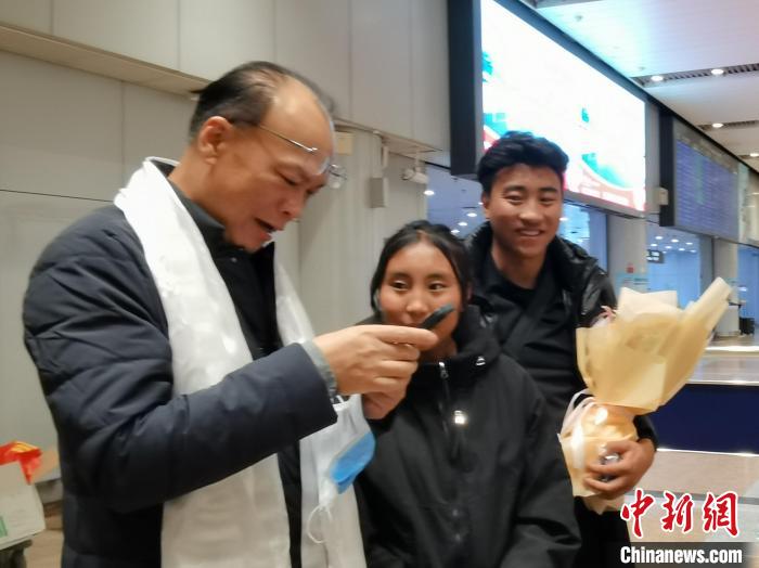 11月14日下午,來自西藏自治區(qū)昌都市的8名脊柱側(cè)彎患者到達(dá)北京首都國際機(jī)場。圖為北京大學(xué)第一醫(yī)院骨科主任李淳德(左)和藏族女孩澤巴央宗、哥哥貢布鄧珠交談?!⌒煅┈?攝
