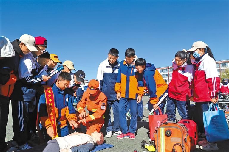 圖為消防員向同學(xué)們傳授急救知識(shí)。洛桑頓珠 記者 盧文靜 攝
