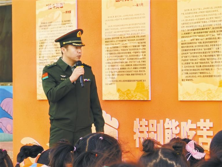 圖為西藏軍區(qū)某部干部袁文韜為拉薩市城關區(qū)第四幼兒園的師生們講解英雄墻上的英勇事跡。記者 武沛濤 攝