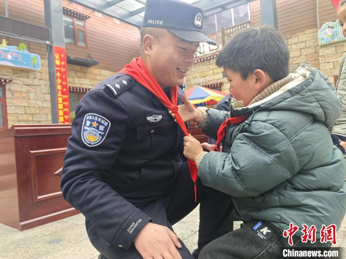 圖為小朋友正在為玉麥邊境派出所民警佩戴紅領(lǐng)巾。扎西根培 攝