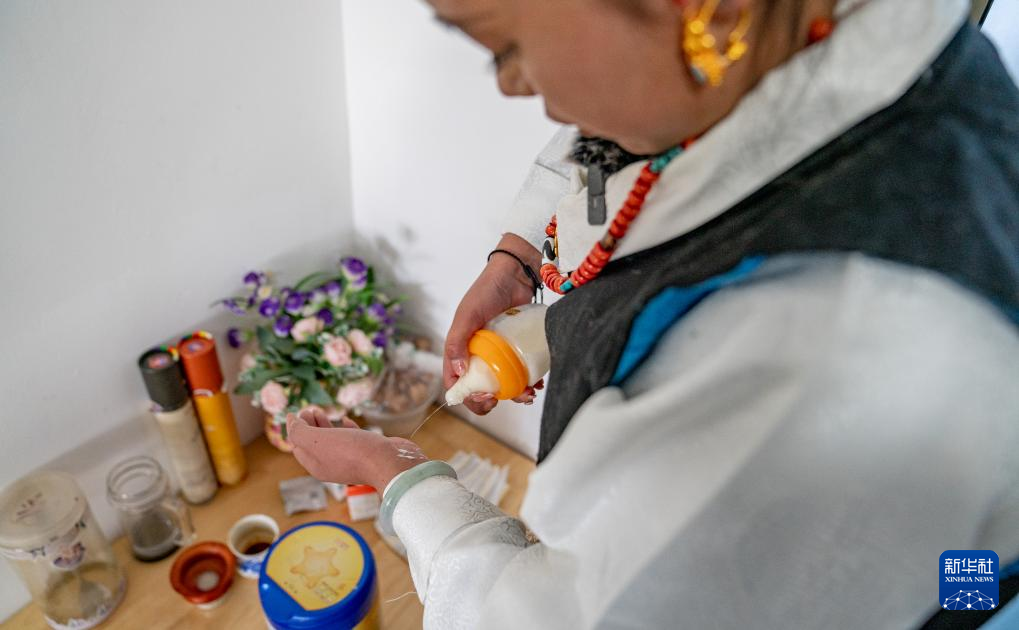 1月8日,旦增卓瑪給孩子沖奶粉時試溫。新華社發(fā)(丁增尼達(dá)攝)