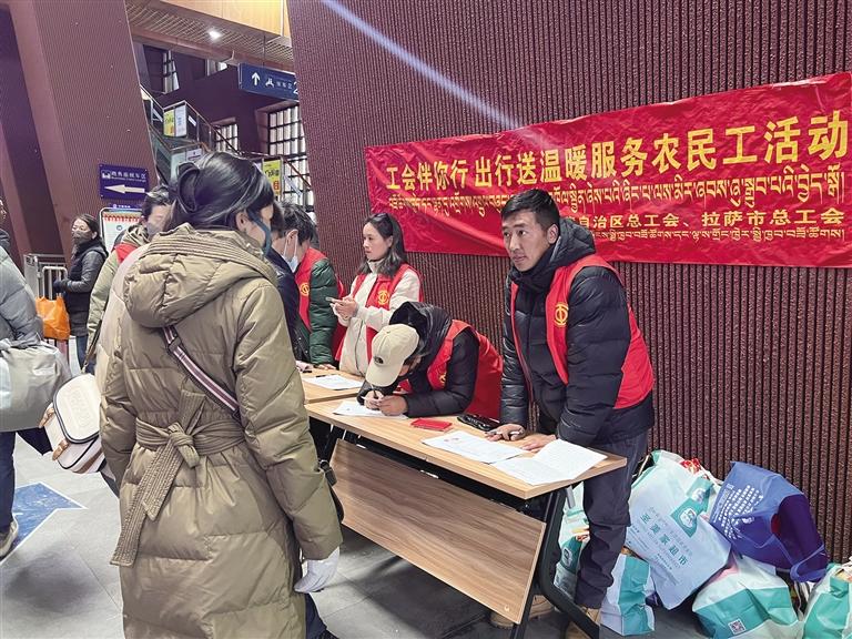 1月31日,西藏自治區(qū)總工會(huì)與拉薩市總工會(huì)聯(lián)合柳梧新區(qū)公安局應(yīng)急處突大隊(duì)、中國(guó)青藏鐵路集團(tuán)有限公司,在拉薩火車站內(nèi)為返鄉(xiāng)農(nóng)民工發(fā)放1000份“工會(huì)愛(ài)心大禮包”,并提供乘車咨詢、便民服務(wù)、維持秩序等服務(wù),將工會(huì)組織的溫暖送到農(nóng)民工心坎上。