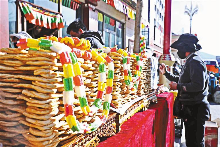 定好了藏裝的布料和款式,索朗玉珍便和母親步行來到了八廓商城,奔向卡賽、風干牦牛肉、奶渣、糖果等年貨銷售區(qū)。