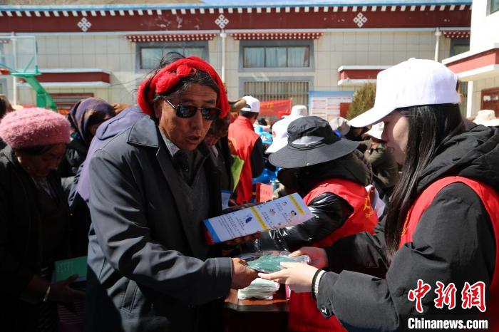 圖為瓊結(jié)縣志愿者為民眾發(fā)放宣傳禮品。倫珠澤仁攝