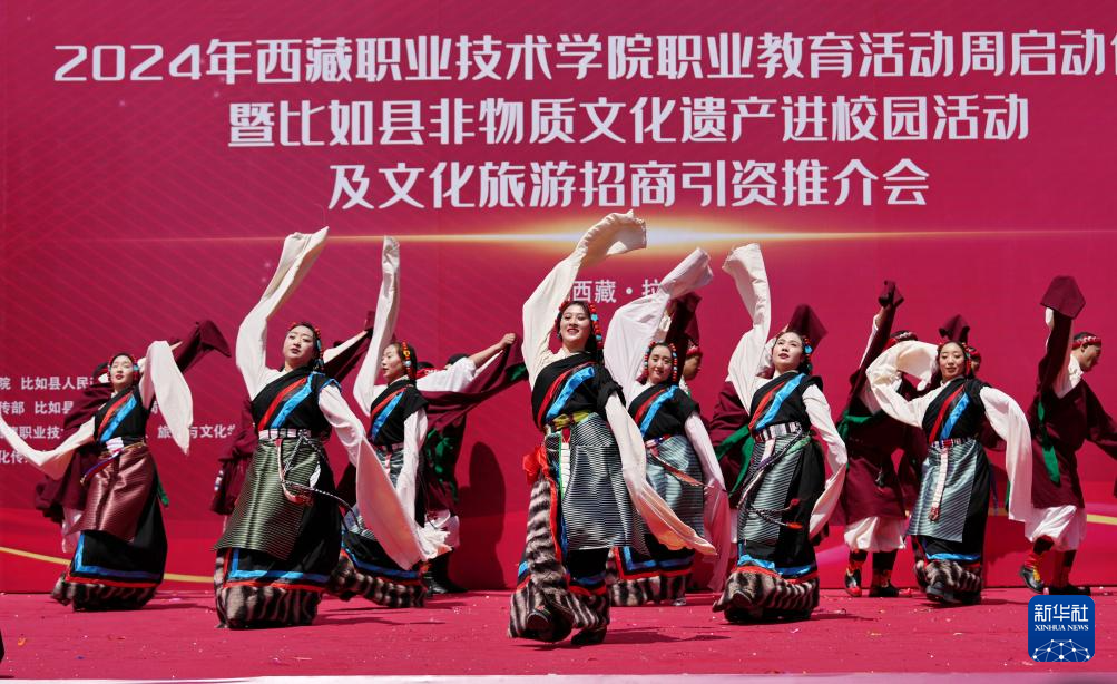 當(dāng)日,西藏職業(yè)技術(shù)學(xué)院職業(yè)教育活動周在拉薩啟動,那曲市比如縣民族藝術(shù)團(tuán)非物質(zhì)文化遺產(chǎn)表演暨“鄉(xiāng)村振興 那曲奮進(jìn)”旅游推介走進(jìn)校園,激發(fā)人們對傳統(tǒng)文化和特色旅游的興趣。