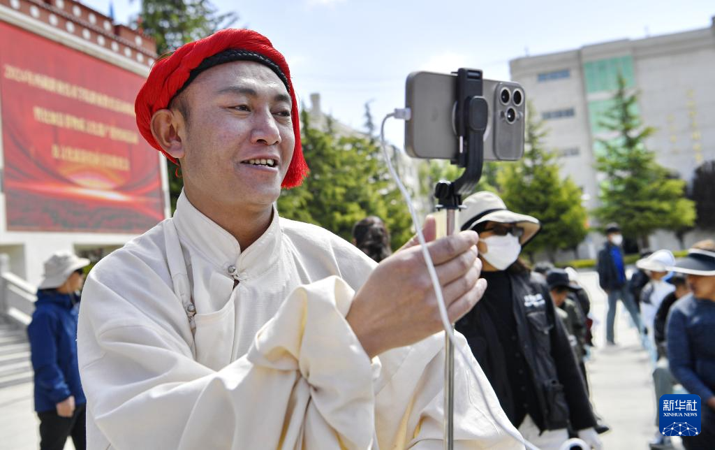 5月12日,在西藏職業(yè)技術(shù)學(xué)院職業(yè)教育活動周啟動儀式暨比如縣非物質(zhì)文化遺產(chǎn)進(jìn)校園活動上,來自比如縣的一名旅游推介者在做現(xiàn)場直播。新華社記者 張汝鋒 攝