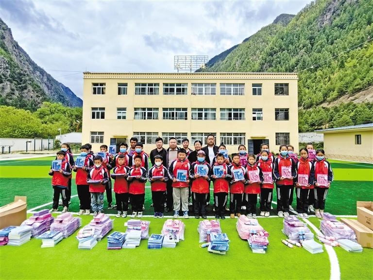 圖為林芝市紅十字會工作人員為八蓋鄉(xiāng)幼兒園捐贈學(xué)習(xí)用品。記者 胡文 攝