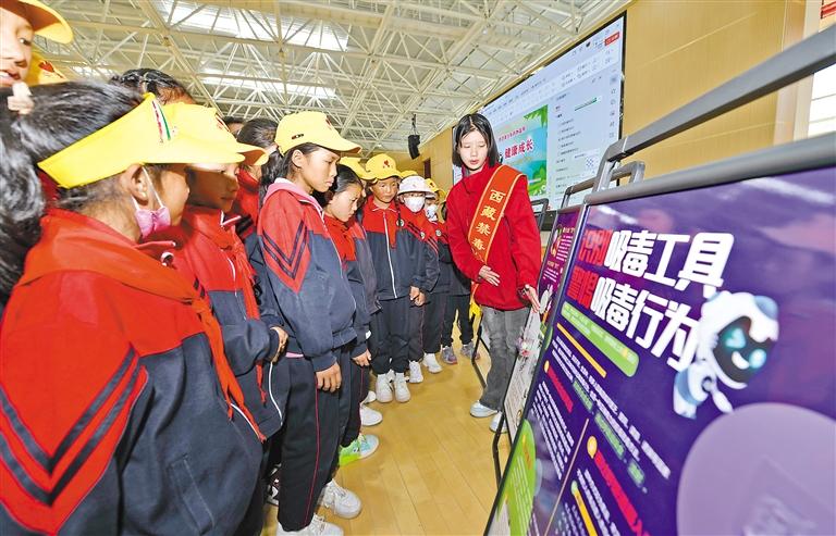 志愿者為拉薩市尼木縣小學(xué)師生講解禁毒知識。記者 唐斌 攝