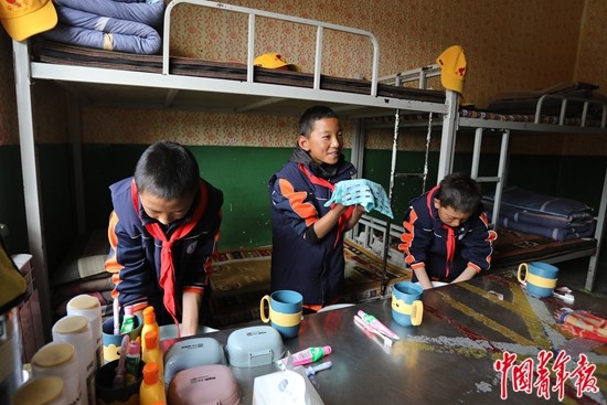 9月14日,西藏那曲市班戈縣第二(中石化)小學(xué),學(xué)生們午休后在宿舍里洗漱。部分離家較遠(yuǎn)的學(xué)生,可以選擇讀書期間全程住校,生活起居都有專門的老師照顧。中青報(bào)·中青網(wǎng)記者 孔斯琪 攝