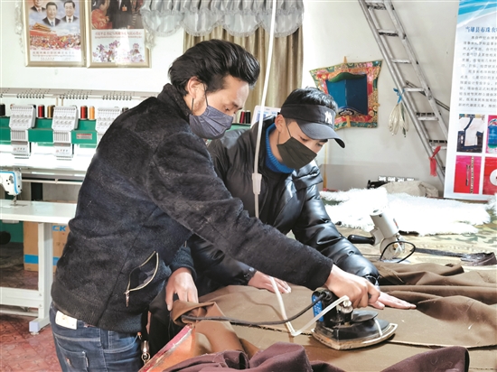 56歲的貢覺是烏瑪塘鄉(xiāng)郭尼村村民,因?yàn)橥炔繗埣矡o法干重體力活,家里也沒有其他收入來源,后來布珠手把手教他縫紉技術(shù),他現(xiàn)在是合作社的一名縫紉工?!拔沂?017年來合作社的,現(xiàn)在每月工資有三千元,生活發(fā)生了很大的變化,一天比一天好了,在這里我學(xué)會(huì)了手工縫紉、機(jī)器縫紉等?!必曈X告訴記者,自己不僅僅解決了溫飽,更是學(xué)到了一門謀生的好手藝。