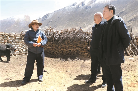 4月14日至15日,區(qū)黨委常委、拉薩市委書記白瑪旺堆深入林周縣開展脫貧攻堅調(diào)研督戰(zhàn)工作。圖為白瑪旺堆來到林周縣旁多鄉(xiāng)達(dá)龍村,向村里工作人員了解村民脫貧增收、牦牛養(yǎng)殖等情況。