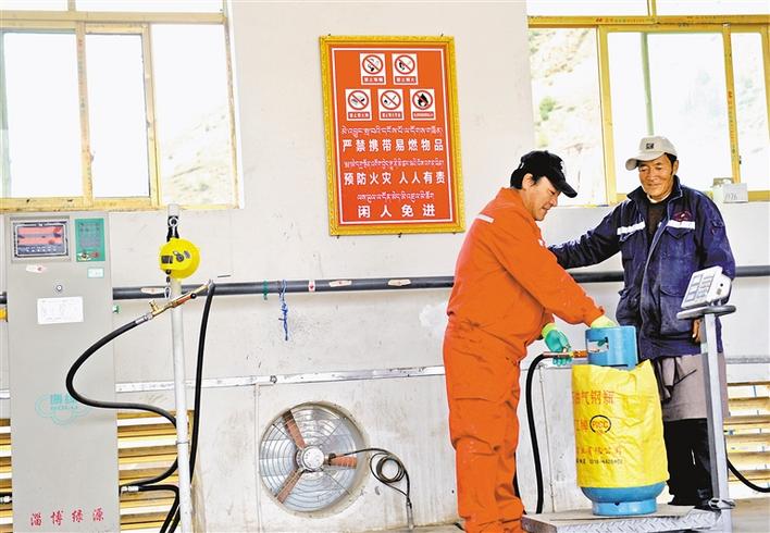 比如縣江然村長廊液化加氣站,61歲的致富帶頭人貢覺才培(左一),正在熟練地和工人給煤氣罐加氣。