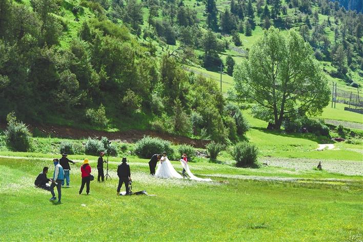 在峽谷深處的類烏齊縣伊日鄉(xiāng)水提村,傳統(tǒng)藏式民居層疊錯落,屋頂上飄揚著鮮艷的五星紅旗。村邊的小溪旁,一對新人正在拍攝婚紗照?!耙寥諐{谷是我父親推薦的景點,我們早晨從市區(qū)出發(fā),特地來這拍照?!毙吕杉佑揽酥檎f,“如此美麗迷人的風景,回去后我一定會推薦給親朋好友?!?/p>