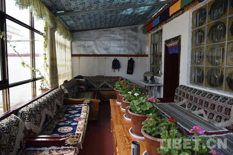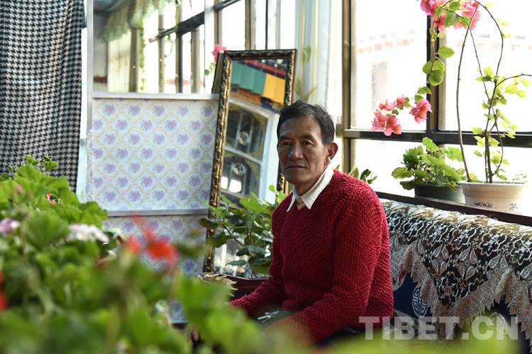 采訪中,印象最深的是索南益西家的那些花。一株三角梅放在陽(yáng)光房的窗臺(tái)上,陽(yáng)光照耀下,明媚亮眼。海棠花最多,扦插不久的海棠花并不高,陽(yáng)光房的桌子上有六七盆,開(kāi)著或紅或粉或白的花。還有一盆吊蘭,藤蔓隨著繩子攀爬,向屋頂延伸。