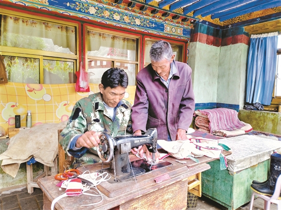 俊巴村的皮具制作于2008年被評定為自治區(qū)級非物質(zhì)文化遺產(chǎn)。圖為拉巴老人和兒子正在制作皮具。 拉薩融媒記者 莫瑞英攝