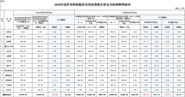 附件:2020年拉薩市財政脫貧攻堅統(tǒng)籌整合資金分配調(diào)整明細表