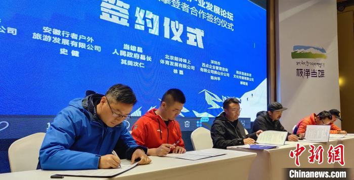 圖為當雄縣官方與30余家戶外俱樂部、文化賽事機構和企業(yè)單位代表進行合作簽約?!∝暽@?攝