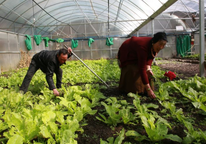 圖為嘎達彭措(左一)與妻子在蔬菜大棚忙碌 圖片來源:康巴傳媒