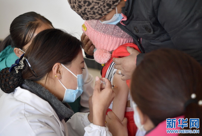 在西藏山南市貢嘎縣吉雄鎮(zhèn)紅星社區(qū)便民服務中心,縣疾控中心的醫(yī)生為小朋友接種疫苗(11月25日攝)。新華社記者 張汝鋒 攝