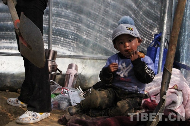 圖為村中小孩在靈芝種植大棚一隅悠閑地吃著零食