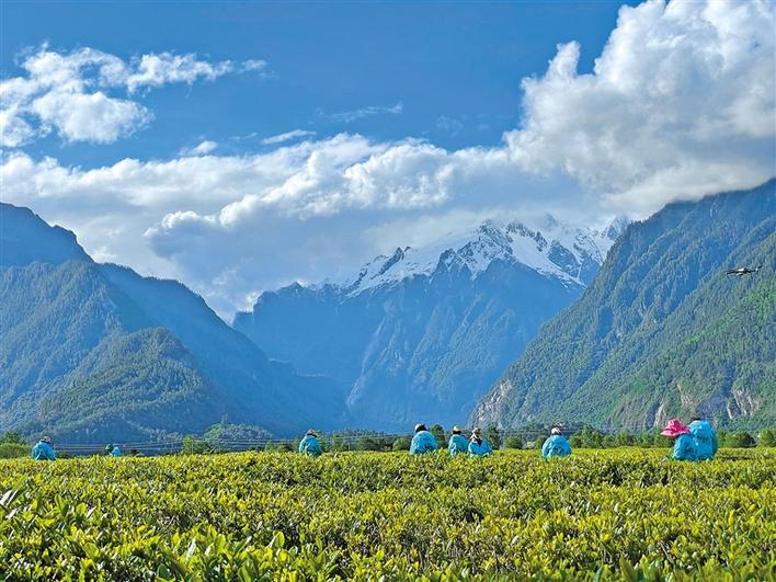 天朗氣清,茶韻悠悠。西藏林芝波密縣易貢茶場里,油菜花開得正艷;廣袤的湖畔牧場上,馬牛成群;茶農(nóng)們穿梭在茶林間,他們身挎茶簍,兩手并用,掐準(zhǔn)“一葉一茶”,快速放入簍里,舉手低頭間,茶簍逐漸被裝滿。