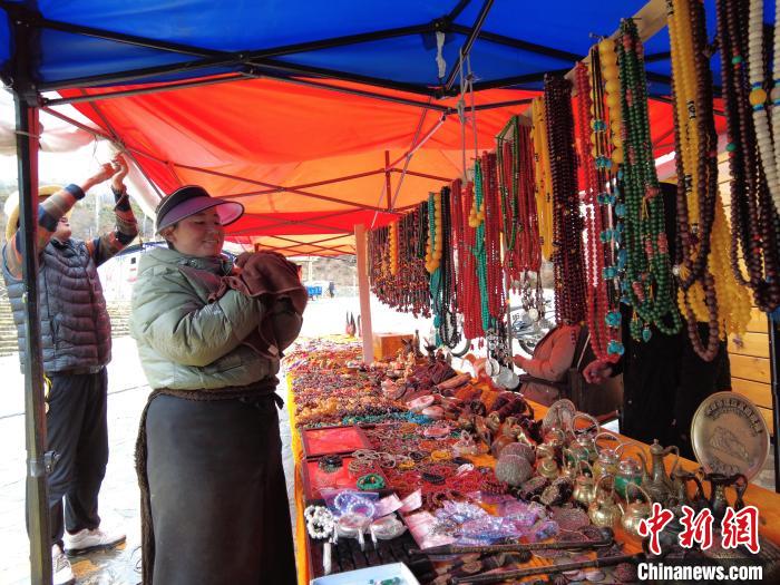 圖為尼瑪拉措在林芝市米林縣的南迦巴瓦觀景臺上擺攤賣貨?!∥鞑刈灾螀^(qū)交通運輸廳供圖