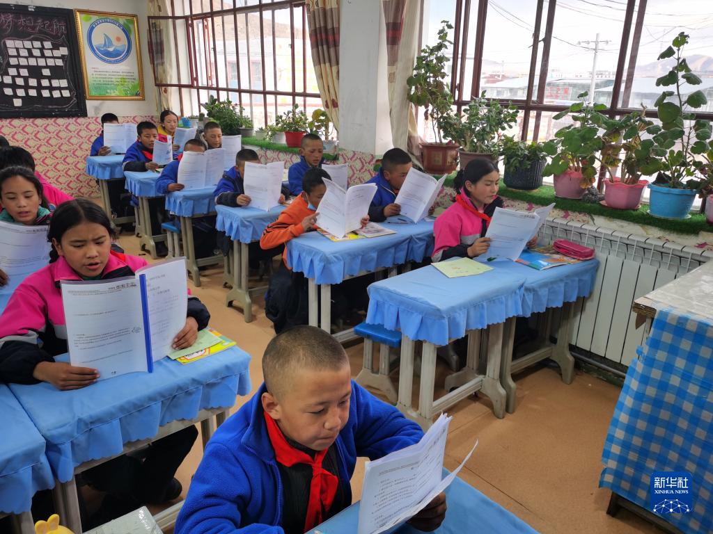 西藏阿里地區(qū)革吉縣完全小學(xué)六年級一班的學(xué)生們正在供暖的教室里學(xué)習(xí)。(強巴曲珍 攝)