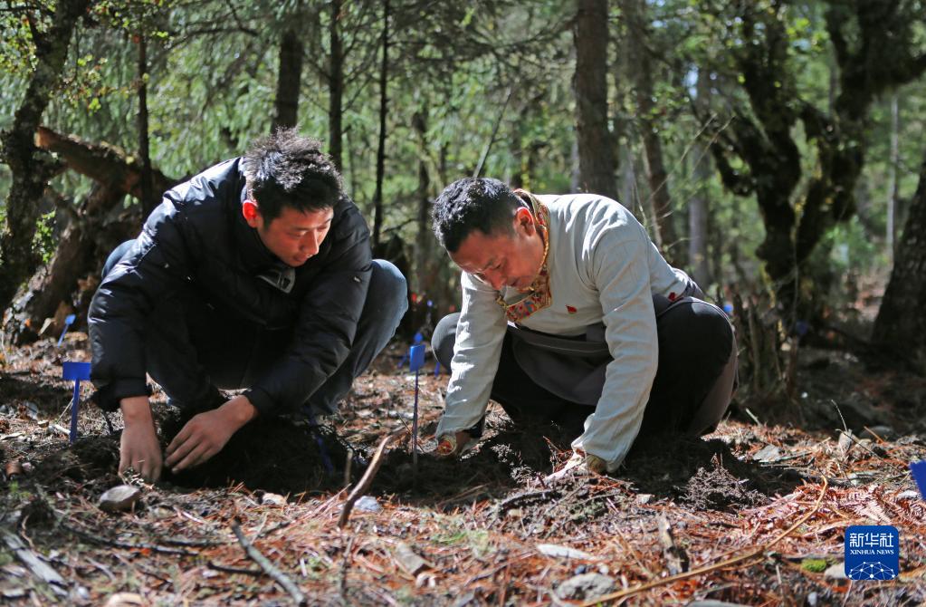 巴桑頓珠(右)與村民在天麻種植園里進(jìn)行日常管護(hù)(3月24日攝)。新華社記者邵澤東 攝
