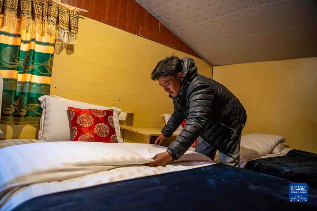 在珠峰游客大本營的帳篷旅館,扎西次仁在整理床鋪(5月13日攝)。新華社記者 晉美多吉 攝