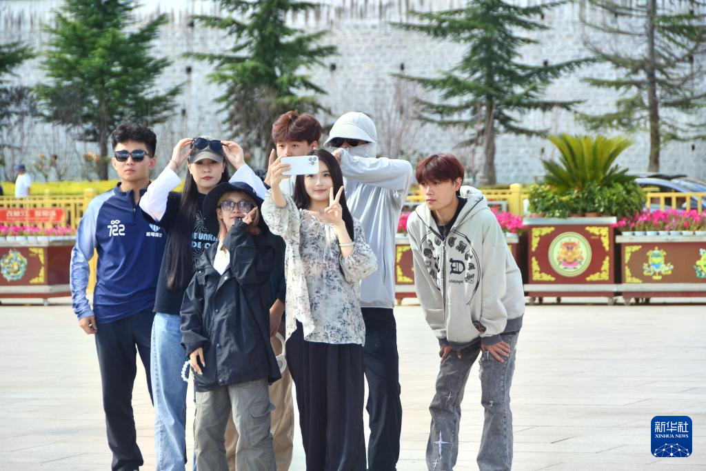 8月17日,布達(dá)拉宮廣場,游客們拍照留念。新華社記者 劉文博 攝