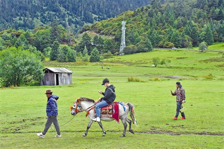在平措大叔家庭旅館內(nèi)住宿的游客體驗騎馬。 記者 張猛 攝