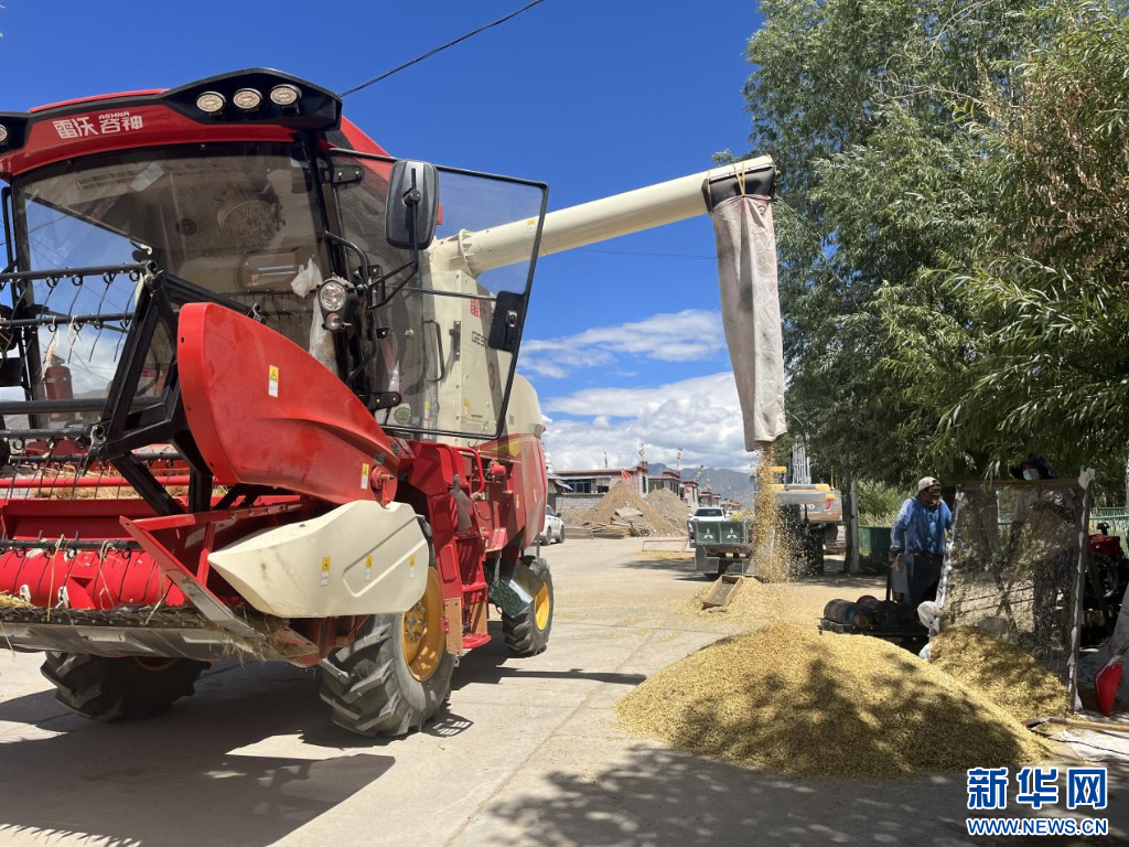 秋收時節(jié),西藏各地加快推進秋收工作。在西藏拉薩市達孜區(qū),金色的田野里聯(lián)合收割機、拖拉機和電動三輪車來回穿梭,收割、摘穗、秸稈粉碎、運輸……一片繁忙景象。