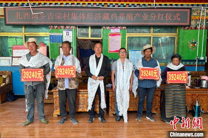 圖為分紅活動現(xiàn)場,吉榮村四個組代表領取藏雞養(yǎng)殖分紅。西藏自治區(qū)科技廳駐吉榮村工作隊 供圖