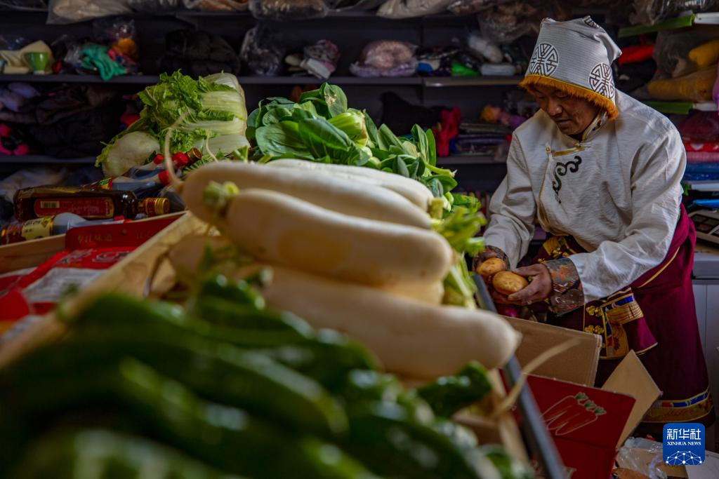申扎縣馬躍鄉(xiāng)貝嘎四村“偏遠鄉(xiāng)鎮(zhèn)果蔬配送試點項目”直銷點,店主西熱加措在整理供銷社配送來的新鮮蔬菜(1月5日攝)。新華社記者姜帆 攝