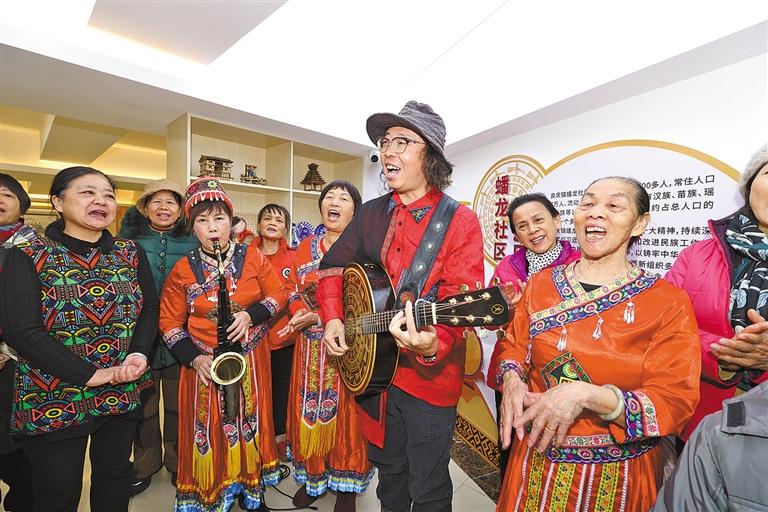 “蟠龍社區(qū)生活著漢族、壯族、瑤族等15個(gè)民族的同胞,少數(shù)民族人口約占社區(qū)總?cè)丝诘?/3?!斌待埳鐓^(qū)黨委副書記許玉君介紹說,社區(qū)結(jié)合多民族“嵌入式”居住的特點(diǎn),創(chuàng)新踐行“136”工作機(jī)制,即圍繞鑄牢中華民族共同體意識(shí)這條主線,通過加強(qiáng)黨的領(lǐng)導(dǎo)、織牢精神紐帶、用好治理平臺(tái)“三個(gè)抓手”,積極創(chuàng)造各民族共居共學(xué)、共建共享、共事共樂的“六共”條件,讓各族群眾像石榴籽一樣緊緊抱在一起?!拔沂菨h族,會(huì)做壯族的特色菜,我愛人是仫佬族,漢字書法練得有模有樣?!斌待埳鐓^(qū)藝術(shù)團(tuán)骨干何繼榮老人說。