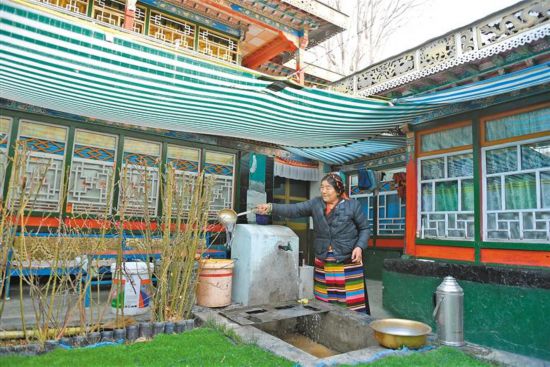 多吉曲珍在院子里接水澆花。溫暖舒適的客廳內(nèi),多吉曲珍的丈夫土旦在看電視,嶄新的電視正播放著藏語(yǔ)譯制劇。[詳細(xì)]
