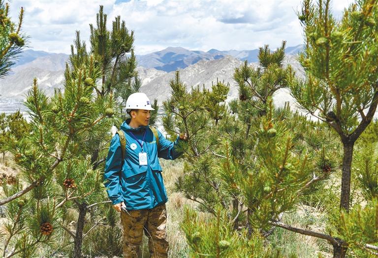 拉薩南北山綠化工程2024年度鞏固提升(貢嘎機(jī)場周邊山體)工程項目上,第三方監(jiān)理人員在檢查樹木狀況。新華社記者 晉美多吉 攝