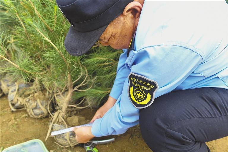 在拉薩南北山綠化工程2024年度鞏固提升(貢嘎機(jī)場周邊山體)工程項目上,林業(yè)檢疫執(zhí)法工作人員在檢查樹苗根部土球是否達(dá)標(biāo)。 新華社記者 晉美多吉 攝