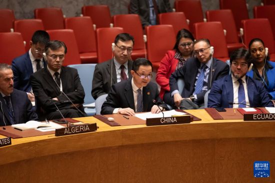 4月14日,在位于紐約的聯(lián)合國(guó)總部,中國(guó)常駐聯(lián)合國(guó)代表團(tuán)臨時(shí)代辦戴兵(前中)在安理會(huì)就伊朗襲擊以色列舉行的緊急會(huì)議上發(fā)言。新華社記者 謝鍔 攝