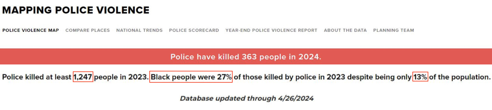 而今年截至4月26日最后一次數(shù)據(jù)更新,全美在不到四個月時間里已有363人命喪警察之手。