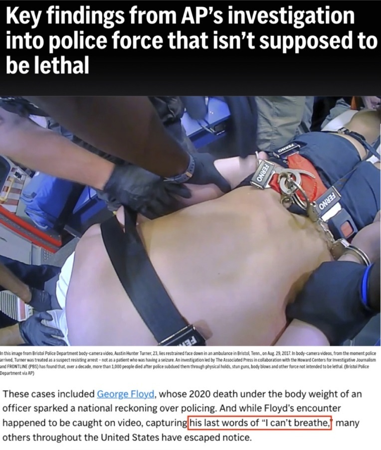美聯(lián)社不久前主導(dǎo)的一項調(diào)查發(fā)現(xiàn),在2012年至2021年的十年間,美國警察使用身體約束、電擊、毆打等所謂“非致命性手段”導(dǎo)致至少1036人死亡,平均每周兩人。