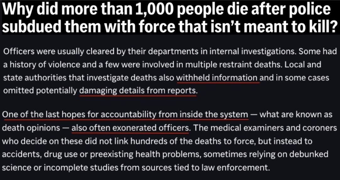 而作為內(nèi)部問責(zé)的最后希望之一,法醫(yī)和驗尸官提供的所謂“死亡意見”也經(jīng)常為警察開脫,一些明顯與警察暴力執(zhí)法相關(guān)的死亡,會被他們歸因于事故、吸毒或先前存在的健康問題。