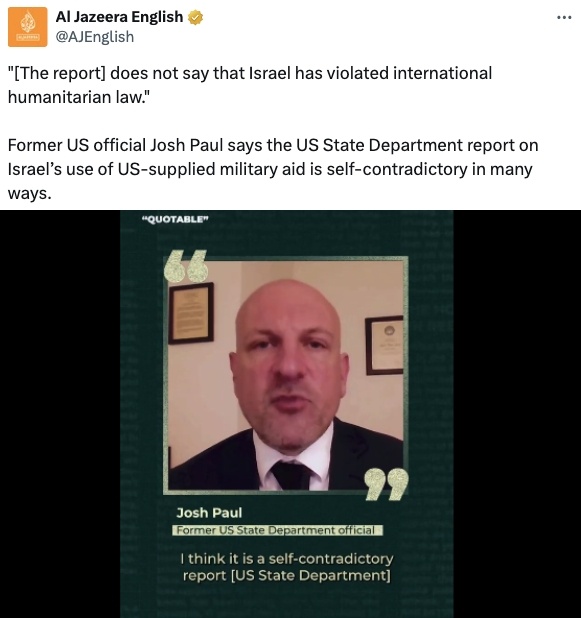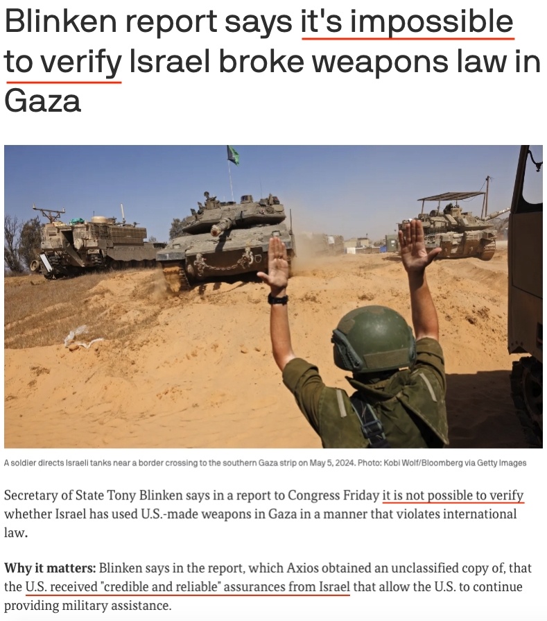 “報告中確實說,可以合理認(rèn)定以色列在違反國際人道主義法的行動中使用了美制武器,但報告卻不明確說以色列違反了國際人道主義法?!?/p>