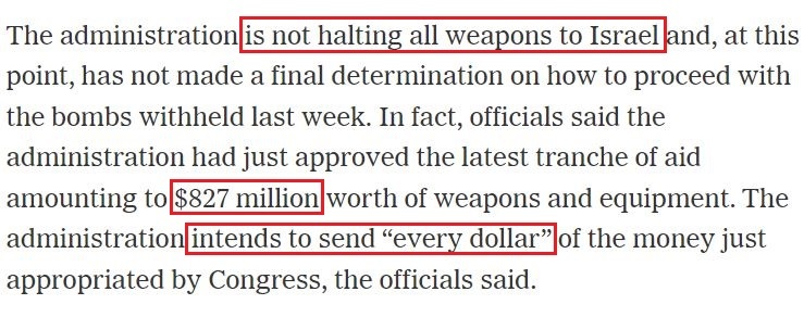 事實上,就在暫停向以色列運送重型炸彈的同時,拜登政府剛剛批準(zhǔn)了最新一批價值8.27億美元的對以軍事裝備援助。用美國官員們的話說,拜登政府打算把最新對以援助撥款的“每一美元”都用出去。